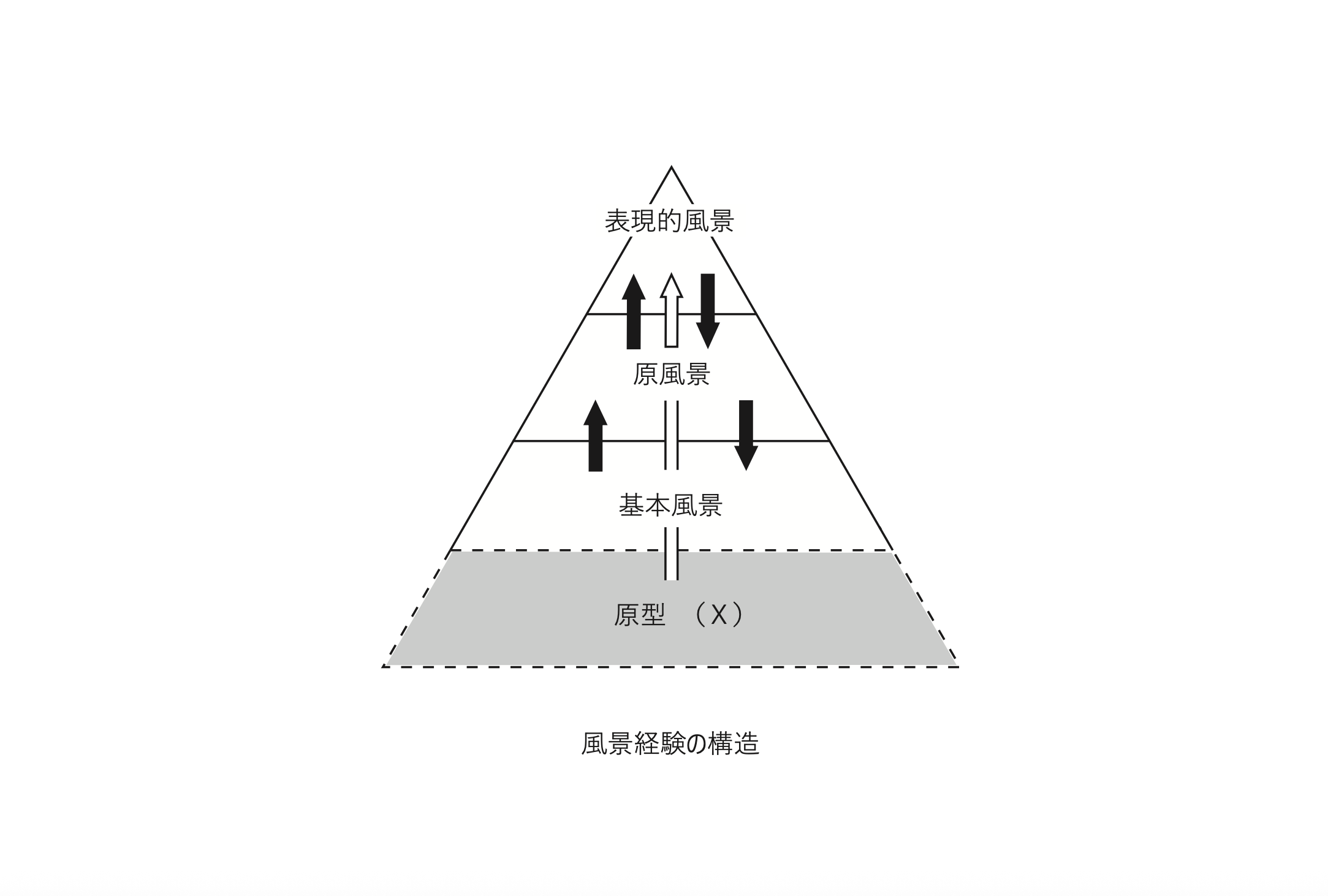 直:そう、ところで「風景経験の構造」モデル(図)をつくってみると、安定した〈型〉と不安定な〈形〉の段階が、交互に出てくるということに気がついた。三角形の底にあたる「原型」(X)は、文字どおり〈型〉。その上の「基本風景」は、個別に異なる〈形〉。その上に、集団的な〈語り〉によって成立する「原風景」は、社会的な〈型〉。そうして最後、三角形の頂点を占めるのは、個の創意によって生じる「表現的風景」、これは〈形〉になる。こんなふうに、下から上へ、〈型→形→型→形〉という順に移行する動きがあるということが分かったのです。これは、大きな発見でした。